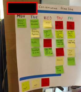 Suggestion: If you’re keeping the post-its from the weekly continuous timeline for a longer project retrospective I found it useful to timestamp the iteration week to facilitate the creation of the project timeline: