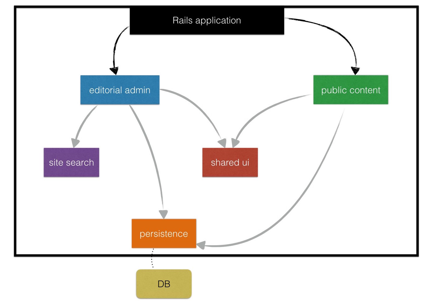 Both admin_ui and public_ui depended on a persistence engine that encapsulated the ActiveRecord models and a shared_ui that contained the erb templates used to display and preview content.