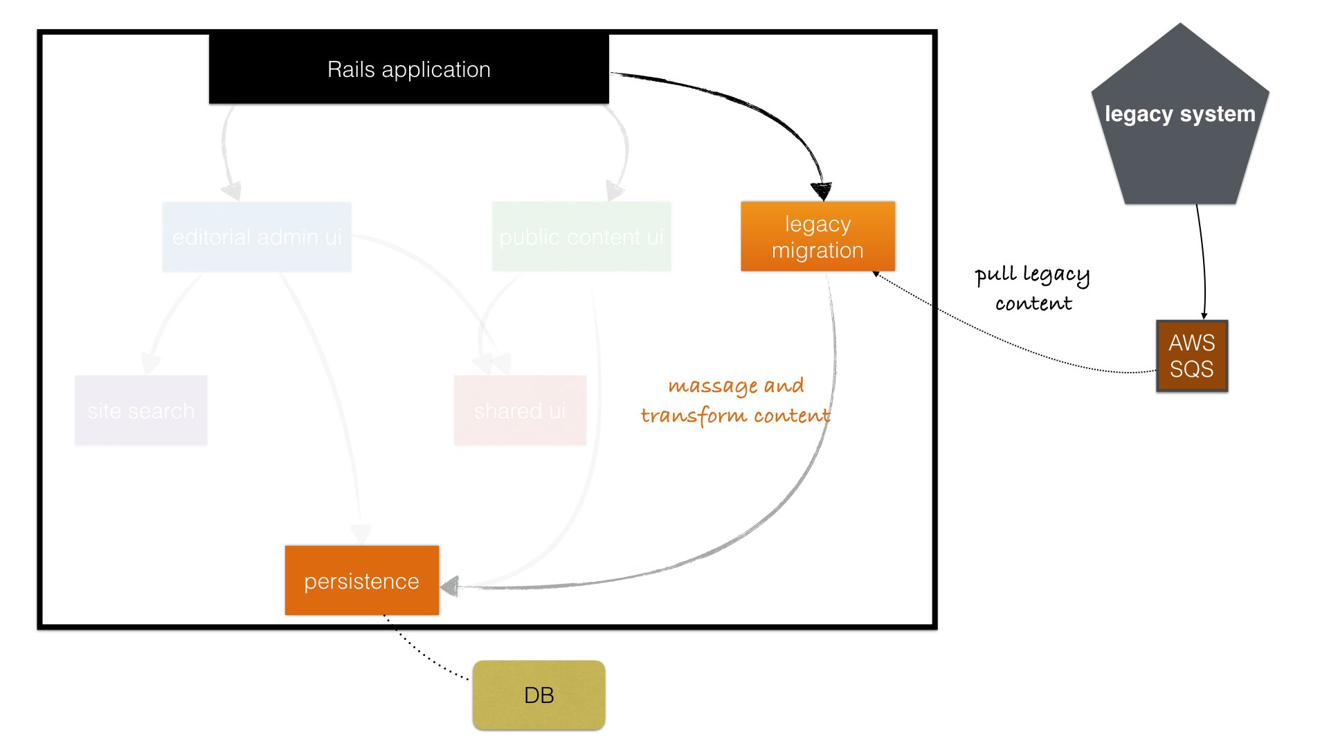 Editors were review existing content in the legacy application and mark it for migration—overnight it would be pushed to an Amazon queue and the Rails application would pull and upsert the content in the new database. We didn’t want to mix that logic with the persistence engine but where else? We encapsulated all that behaviour in one component/engine: legacy_migration—after launch that engine was removed leaving no trace behind about the migration scripts.