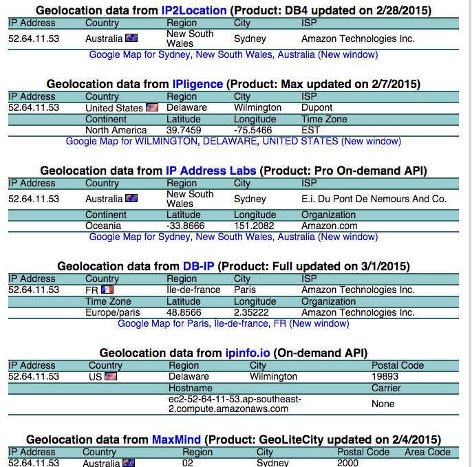 Using whois I found the EC2 instance in Sydney uses an IP registered by Amazon in Seattle: